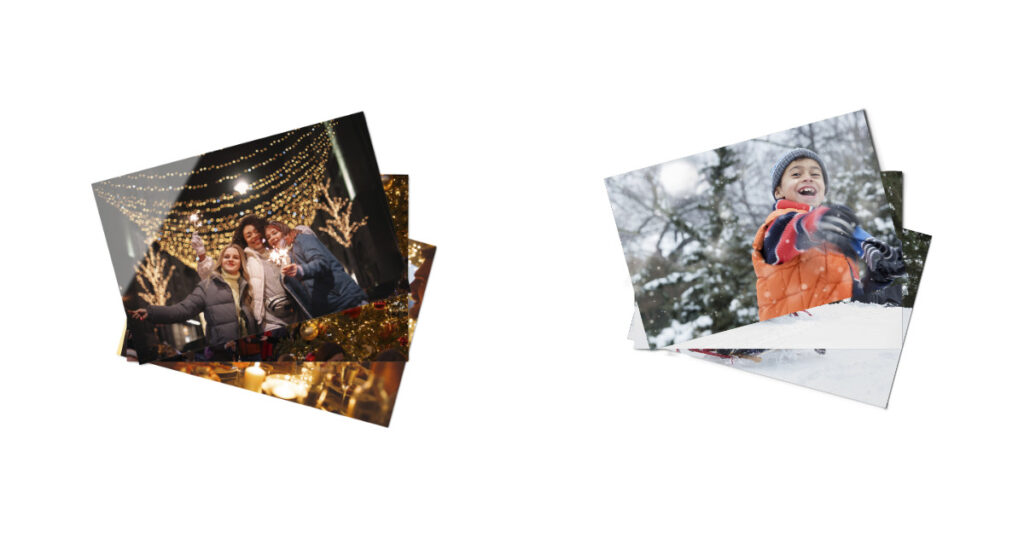 - Gloss finishes: Glossy prints are great if your display is near a window or in a well-lit area. The gloss enhances the vibrancy of the colours and makes the images stand out, especially during the golden hours of winter.